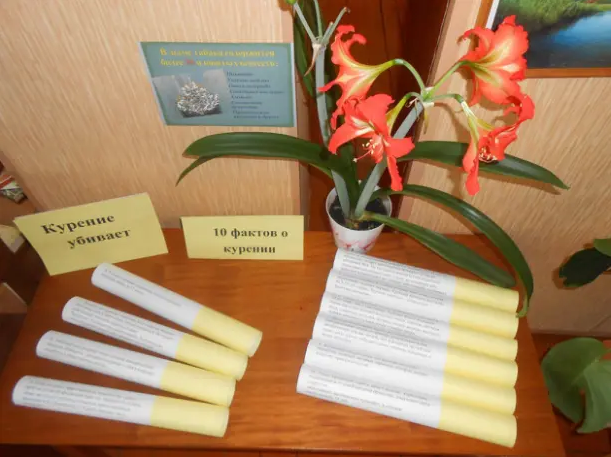 Описание работы: Были изготовлены муляжи сигарет, на которых напечатаны 10 фактов о вреде курения.