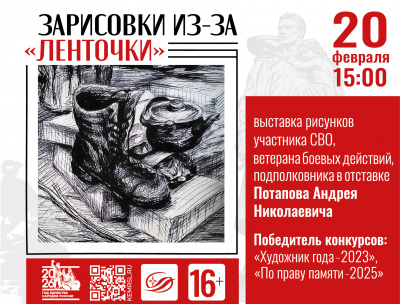 20 февраля 2026 года, в преддверии Дня защитника Отечества, в 15:00 в Фёдоровском зале Государственной научной библиотеки Кузбасса им. В. Д. Федорова состоится торжественное открытие персональной выставки рисунков ветерана специальной военной операции Андрея Николаевича Потапова «Зарисовки из-за ленточки».