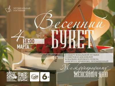 4 марта в 18:00 в Музыкальной гостиной Государственной научной библиотеки Кузбасса им. В.Д. Федорова состоится праздничный концерт учащихся вокально-хорового отделения Детской школы искусств №15 г.Кемерово «Весенний букет», посвященный Международному женскому дню.