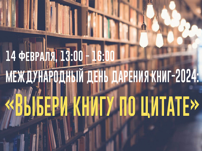 Приглашаем принять участие в событии «Выбери книгу по цитате» в рамках Восьмой общероссийской акции «Дарите книгу с любовью». Данная акция приурочена к Международному дню дарения книг, который отмечается во многих странах мира ежегодно 14 февраля с 2012 года, и с тех пор он стал популярным способом отметить любовь к чтению, поделиться знаниями и вдохновить людей на открытие новых горизонтов.
