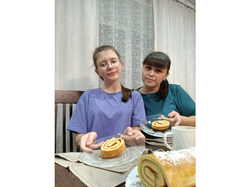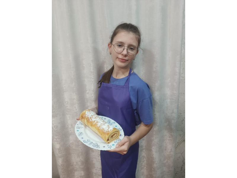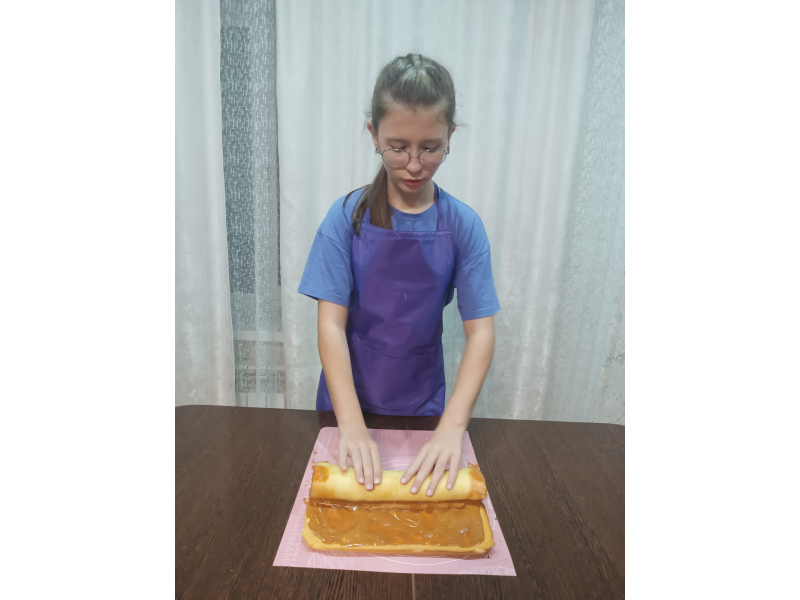 7. Обратной стороной ножа продавите полосу вдоль меньшей стороны бисквита (на расстоянии 1,5-2 см от края) и сверните бисквит рулетом.