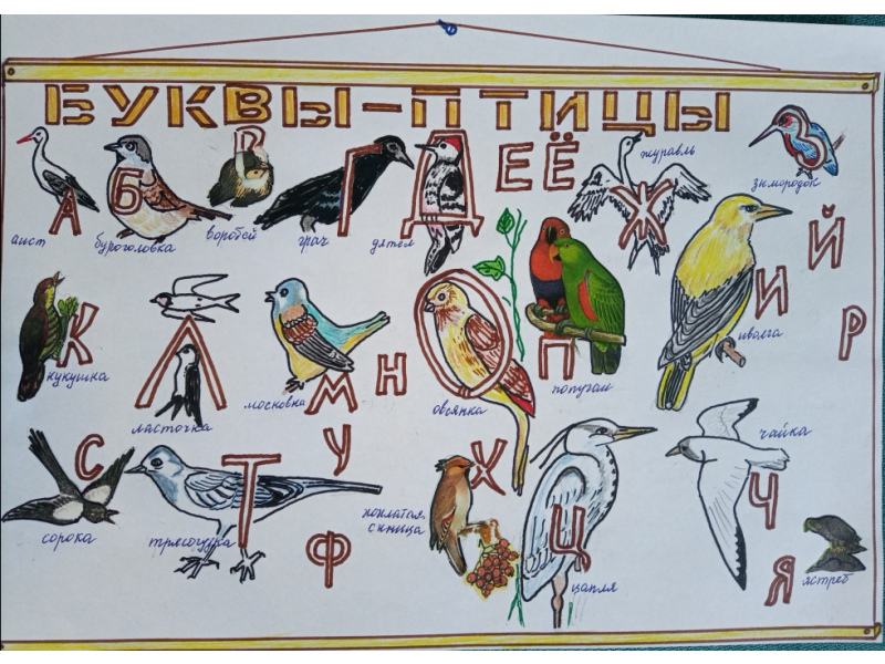 Автор работы: Сапожников Семен Дмитриевич.Описание работы: В работе представлены буквы русского алфавита в виде птиц.Каждой букве соответствует определенная птица.