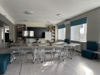 Особенности: Зал разделён на три зоны: 1. место для занятий; 2. зона отдыха;3. зона для проведения мастер-классов и заседаний клубов по интересам.