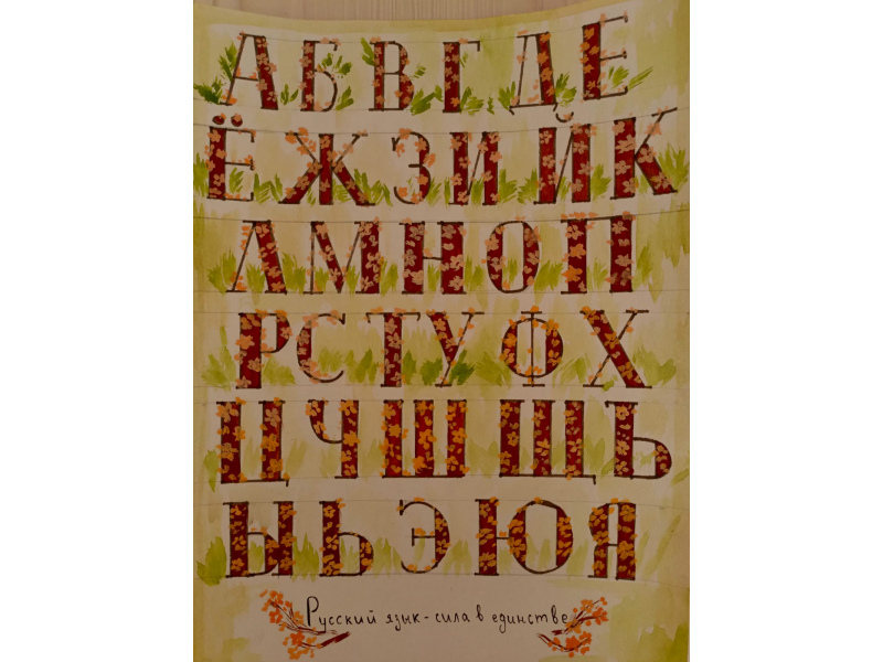 Автор работы: Ржаницина Ульяна Степановна.Описание работы: Из букв, словно из семян, вырастают нежные жёлтые цветы, символизируя мягкость и изящество русского алфавита.