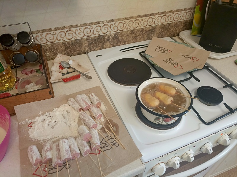 Налейте масло в узкий сотейник с высокими бортиками (так будет удобнее жарить). Поставьте его разогреваться на средний огонь. Как понять, что масло готово для фритюра? Опустите в него деревянную шпажку. Если вокруг нее собрались пузырьки, значит можно приступать к процессу жарки. Если масло очень сильно пузырится, то оно слишком горячее. Корн доги в нем будут гореть. В этом случае убавьте нагрев.