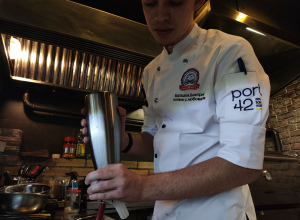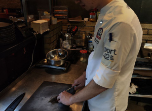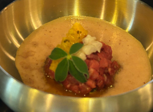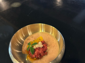 Тар-тар из говяжьей вырезки с соусом "Цитрусовый демигляс" и эспумой из клюквы