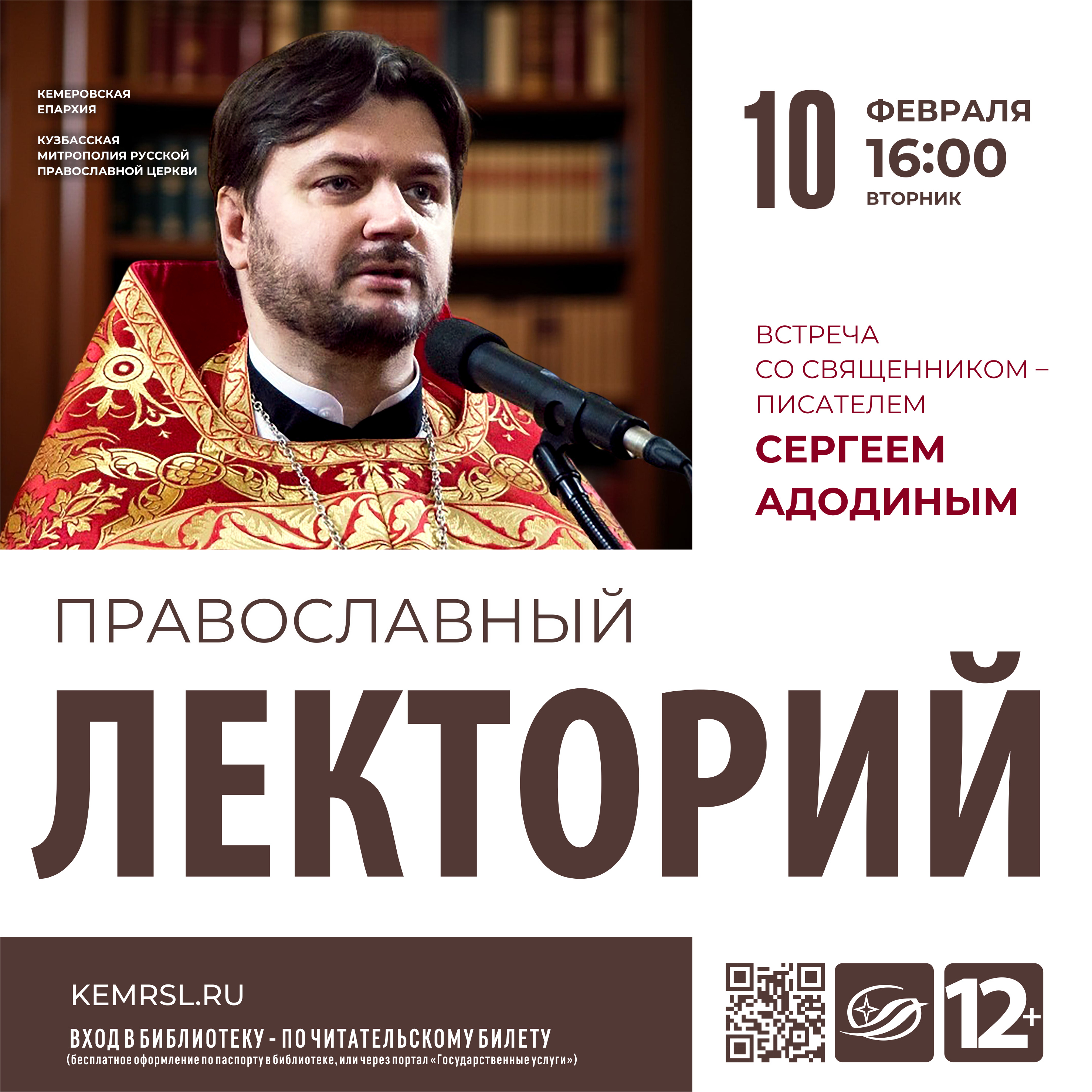 10 февраля в 16.00 в читальном зале сектора библиотечного краеведения (кабинет № 133, 2-й этаж, здание № 2) состоится Православный лекторий, в рамках которого пройдёт творческая встреча с Сергеем Адодиным. Этой встречей мы продолжаем цикл мероприятий культурно-просветительского проекта «Читаем прозаиков Кузбасса».