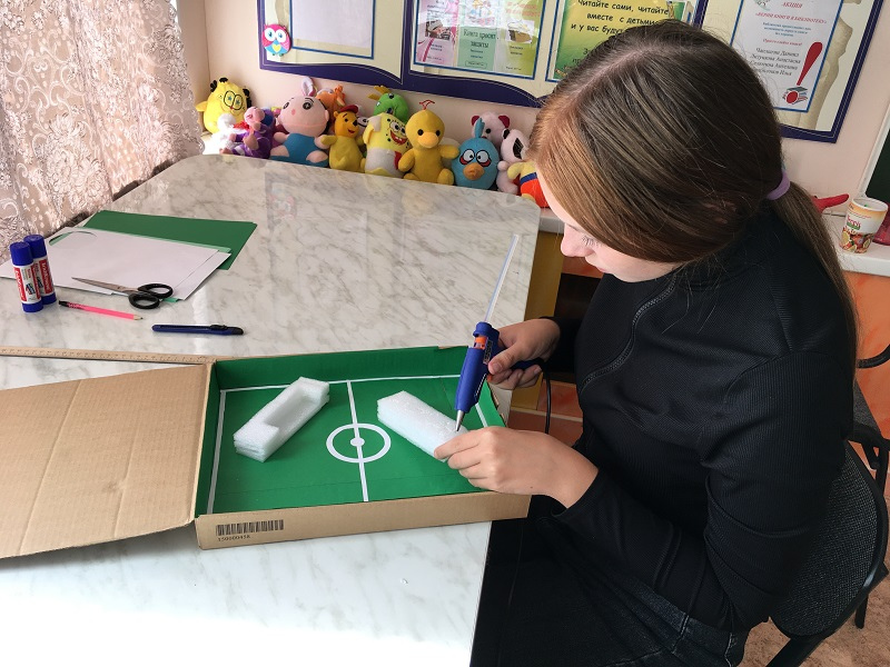 Описание работы: Поделка представляет собой футбольное поле с игроками – литературными героями и мячом в виде большой бусины.