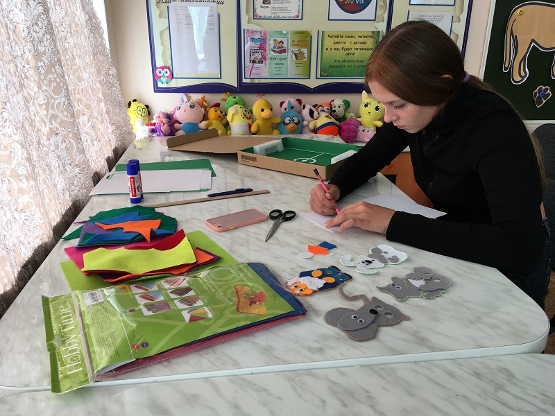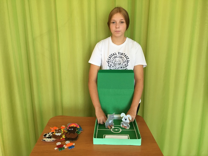 В игру могут играть от 2 человек и более. Игровое поле сделано из коробки, обклеенной цветной бумагой. Игроки (литературные герои разных сказок) сделаны из фетра, обшиты цветными нитками. Каждый игрок имеет отверстия для пальчиков.