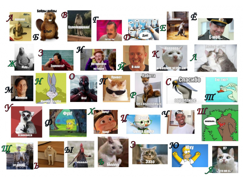 Описание работы: В работе представлен вариант алфавита с веселыми мемами (идеи, изображения, видео и так далее, которые очень быстро распространяются в интернете) популярного интернет-направления, особенно среди молодежи.