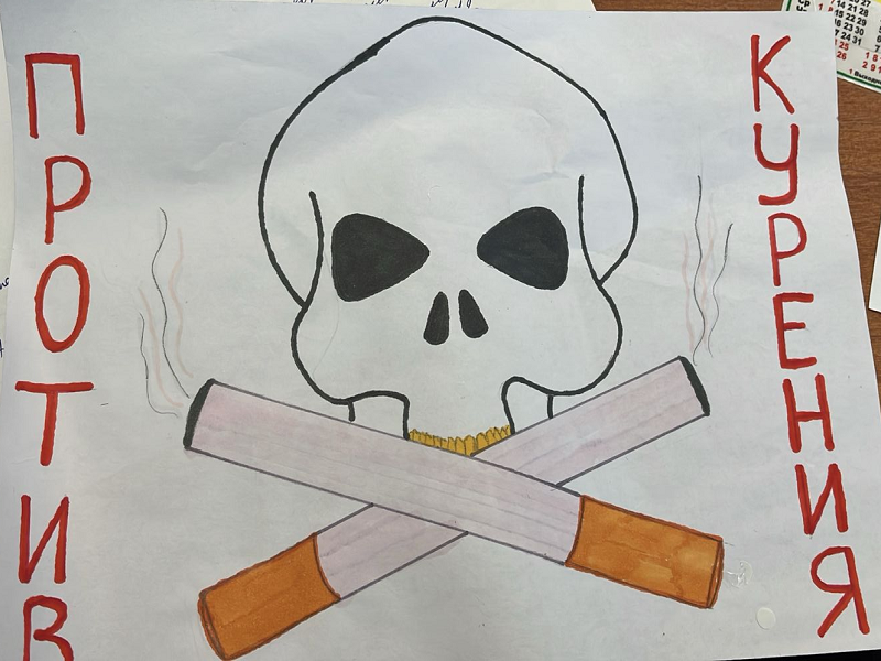 Описание работы: Рисунок "Мы за здоровый образ жизни" представляет собой мощный визуальный манифест против вредных привычек, главным образом курения. В центре композиции изображен череп, символизирующий опасность и последствия употребления сигарет. Вокруг него разбросаны окурки, подчеркивающие убивающий эффект табака на здоровье. Этот рисунок призывает задуматься о своих привычках и направляет на путь к здоровью и долголетию.