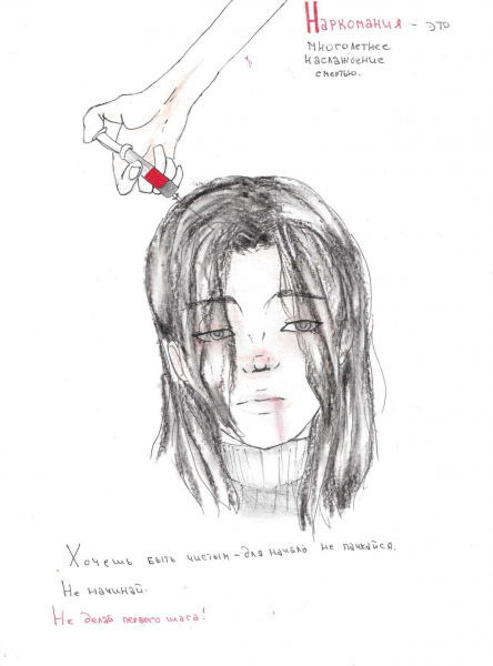 Описание работы: Рисунок выполнен в формате А4 ручкой цветными карандашами и восковым мелком. Употребление наркотиков несет затуманивание разума, подростки которые принимают наркотики у них нет будущего.