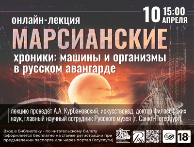 10 апреля в 15:00 Филиал Русского музея в городе Кемерово приглашает всех, кто интересуется искусством XX века, в видеоконференц-зал Государственной научной библиотеки Кузбасса им. В. Д. Федорова на уникальную онлайн-лекцию «Марсианские хроники: машины и организмы в русском авангарде», которую проведёт Алексей Александрович Курбановский – искусствовед, доктор философских наук, главный научный сотрудник Государственного Русского музея (г. Санкт-Петербург).