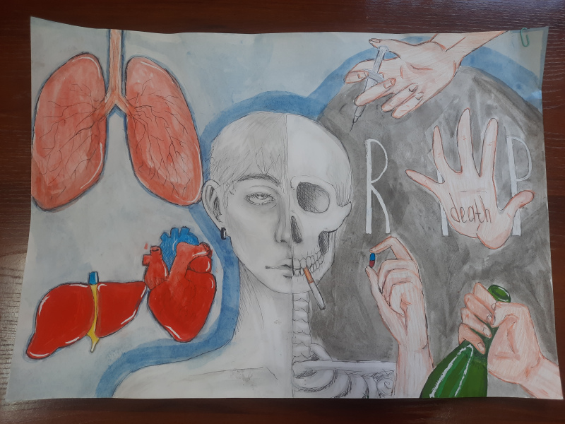 Описание работы: В это изображение я вложила смысл отказа от вредных привычек, показав, что алкоголь, наркотики и курение будут оказывать пагубное влияние на организм человека.