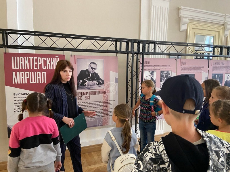 Экскурсовод рассказала ребятам из школы №82 о судьбе и личности угольного генерала Кузбасса. О том, как он трудился в довоенные годы, о том, как бил врага углем в годы Великой Отечественной войны, как поддерживал шахтеров и их семьи в возглавляемом фонде «Шахтерская память».