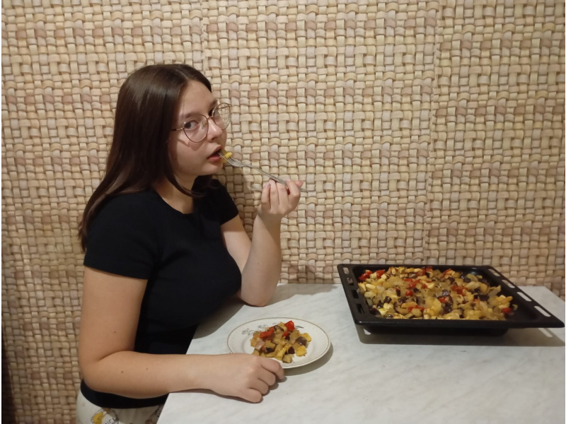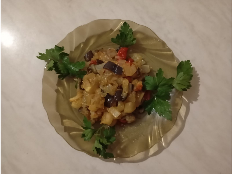 Овощи нарезаем кубиками. Все ингредиенты соединяем, солим, перчим, добавляем приправы, те, которые Вы любите. Маринуем примерно 60 мин., выкладываем на противень и запекаем в духовом шкафу до приготовления. Для подачи украшаем любой зеленью.