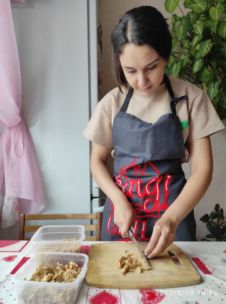 - 1 кг грецких орехов ошпарить кипятком, нарезать большими кусочками и подсушить на подносе, на 2-3 дня.