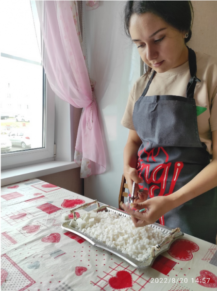 - 0,7 кг рафинада щипчиками нарезать кубиками.