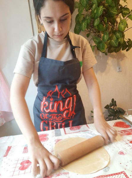 - Раскатать 1 из 4 колобков очень тонко и перенести на смазанный маслом лист, смазанный 2-3 ст.л. топлёного масла.