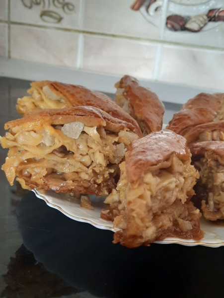 - Острым большим ножом эту конструкцию нарезать на ромбы, смазать желтком и поставить в нагретую до 220С духовку.