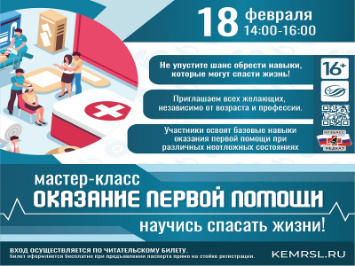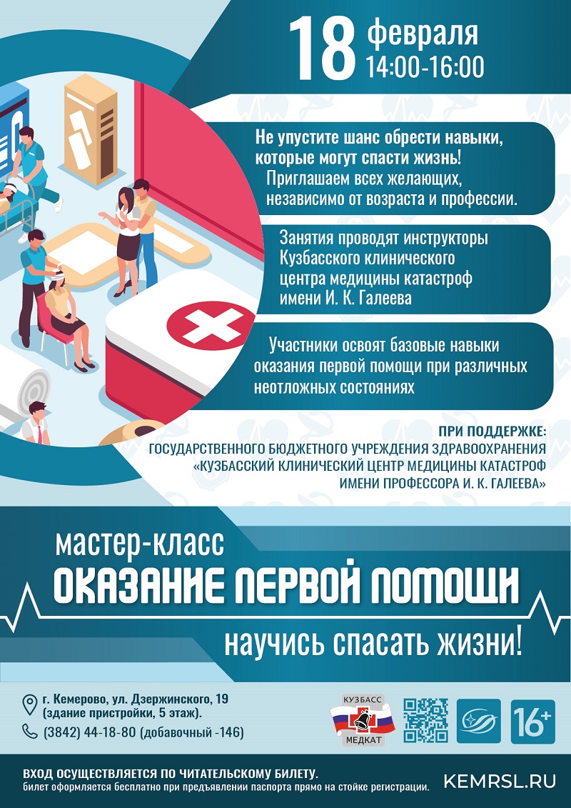 18 февраля 2026 года с 14:00 до 16:00 в Государственной научной библиотеке Кузбасса им. В. Д. Федорова состоится практический мастер-класс «Оказание первой помощи». Опытные инструкторы Кузбасского клинического центра медицины катастроф имени профессора И.К. Галеева проведут интерактивное обучение с использованием манекенов и наглядных пособий, на котором участники смогут отработать практические навыки сердечно‑лёгочной реанимации и другие важные мероприятия, которые могут спасти жизнь.