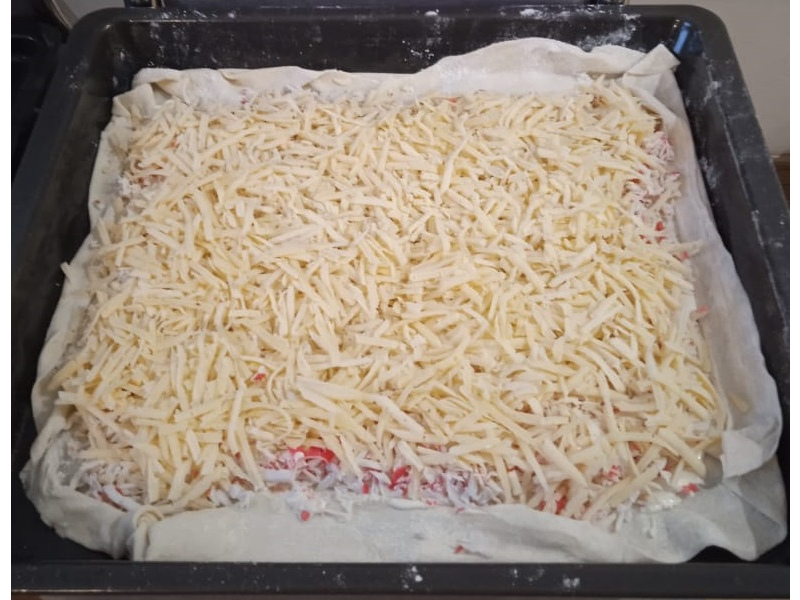 Раскатать один лист дрожжевого слоеного теста, выложить его на противень, предварительно смазанный растительным маслом. Смазать лист теста майонезом, выложить тертые крабовые палочки, посыпать сыром. Раскатать второй лист теста. Выложить его поверх первого. И залепить края. Смазать желтком (немного разбавить водой) сделать вилкой дырочки. Поставить в духовку и запекать 35-40 мин. при температуре 180°С. Потом достать из духовки смазать сливочным маслом, и блюдо готово.