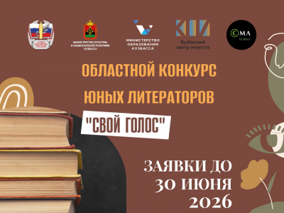 Кемеровское областное отделение Союза писателей России и Совет молодых литераторов Кузбасса объявляют прием заявок для участия в одиннадцатом областном конкурсе юных литераторов «Свой голос». Конкурс проводится при поддержке Министерства культуры и национальной политики Кузбасса, Министерства образования и науки Кузбасса, Государственного автономного учреждения культуры «Кузбасский центр искусств», Центральной модельной библиотеки МБУ «Промышленновская ЦБС» имени Евгения Сергеевича Буравлёва.