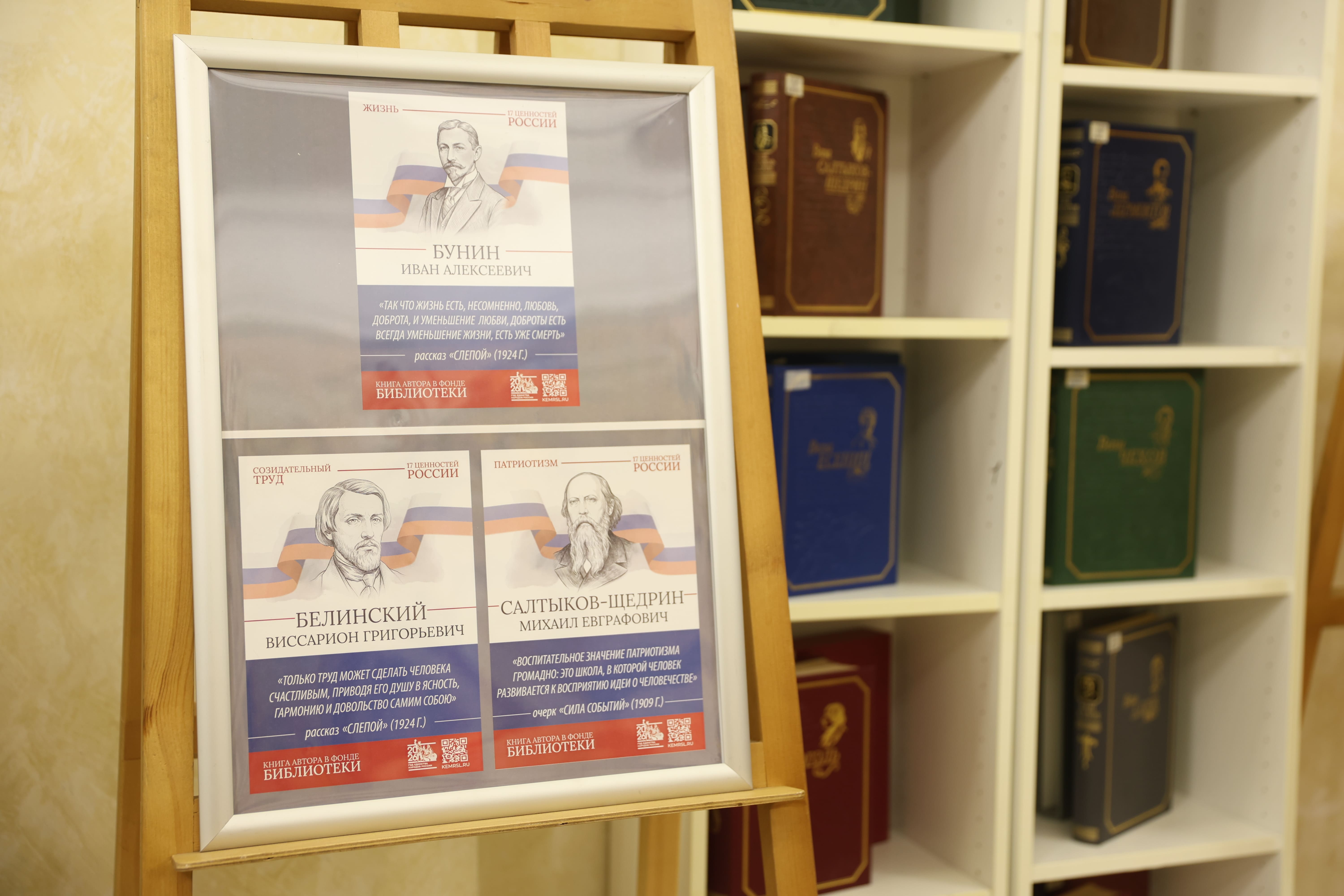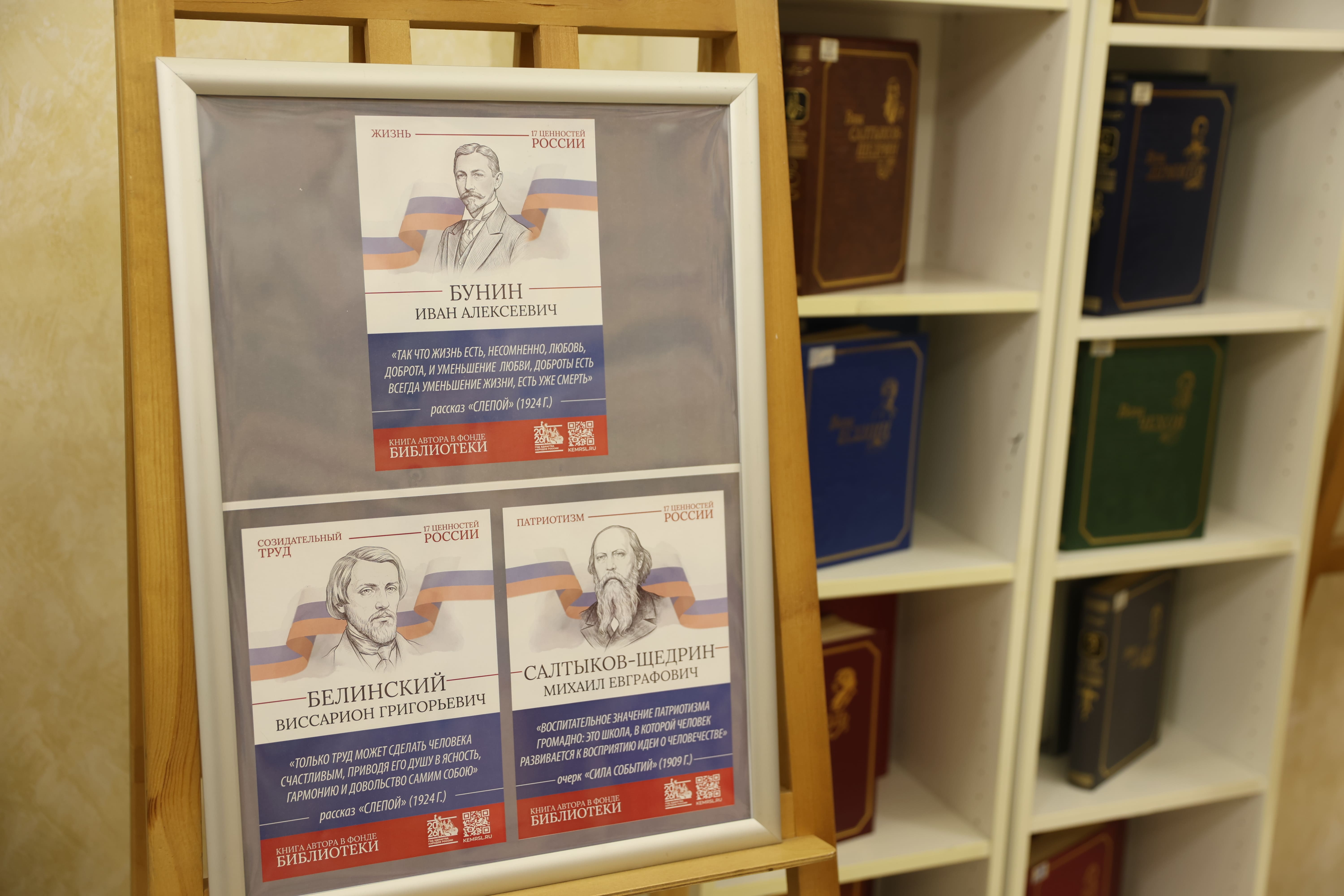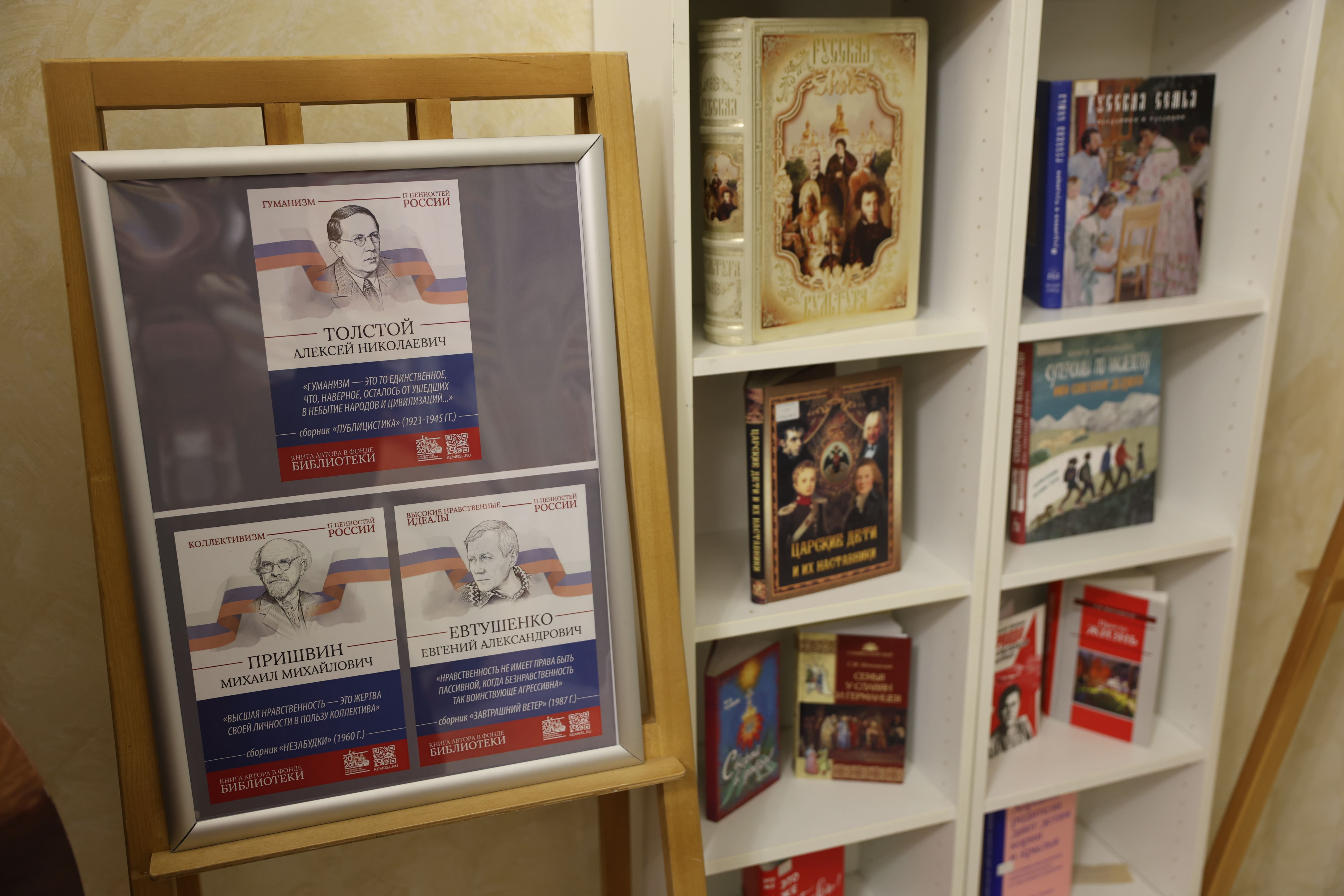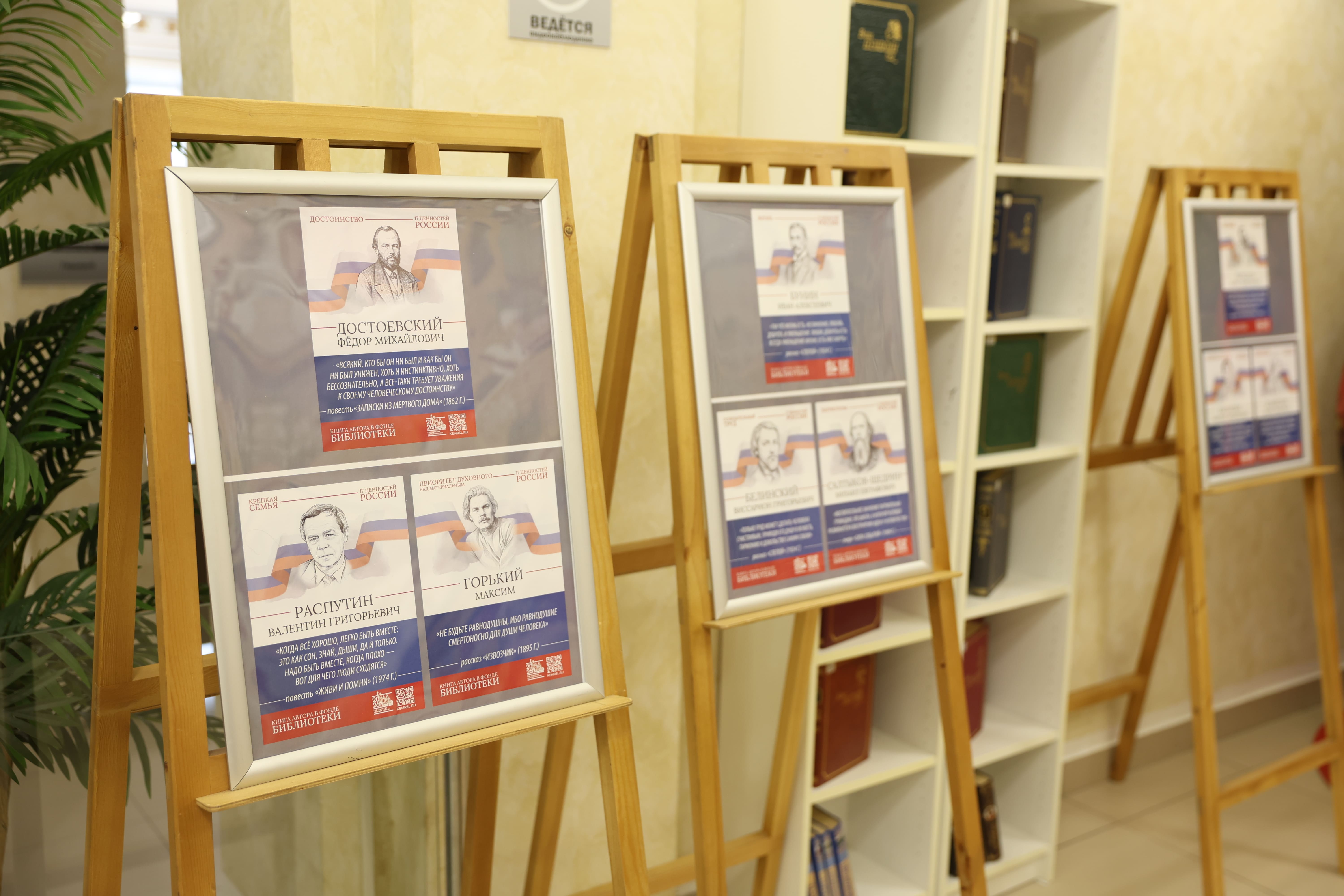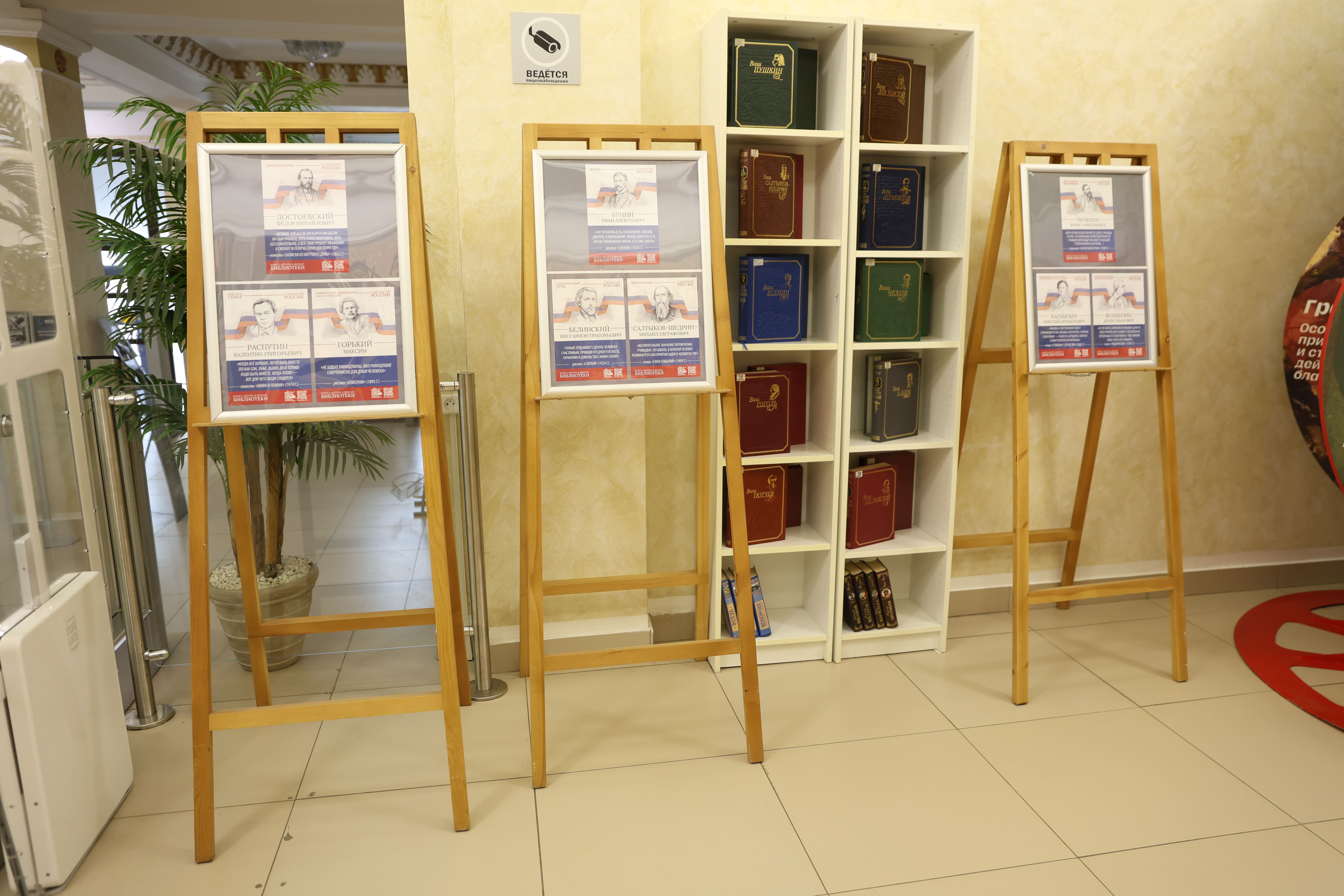 Тематическое пространство дополнено книжной выставкой, где представлены произведения русских писателей, в которых раскрываются эти 17 ценностей. Особое место в экспозиции занимает галерея портретов классиков с цитатами из их трудов. Среди авторов — И.А. Бунин, Б.Н. Чичерин, А.Н. Толстой, Л.Н. Толстой, А.С. Пушкин, М.Е. Салтыков-Щедрин, К.Г. Паустовский, Н.М. Карамзин, Ф.М. Достоевский, Н.А. Некрасов и другие.