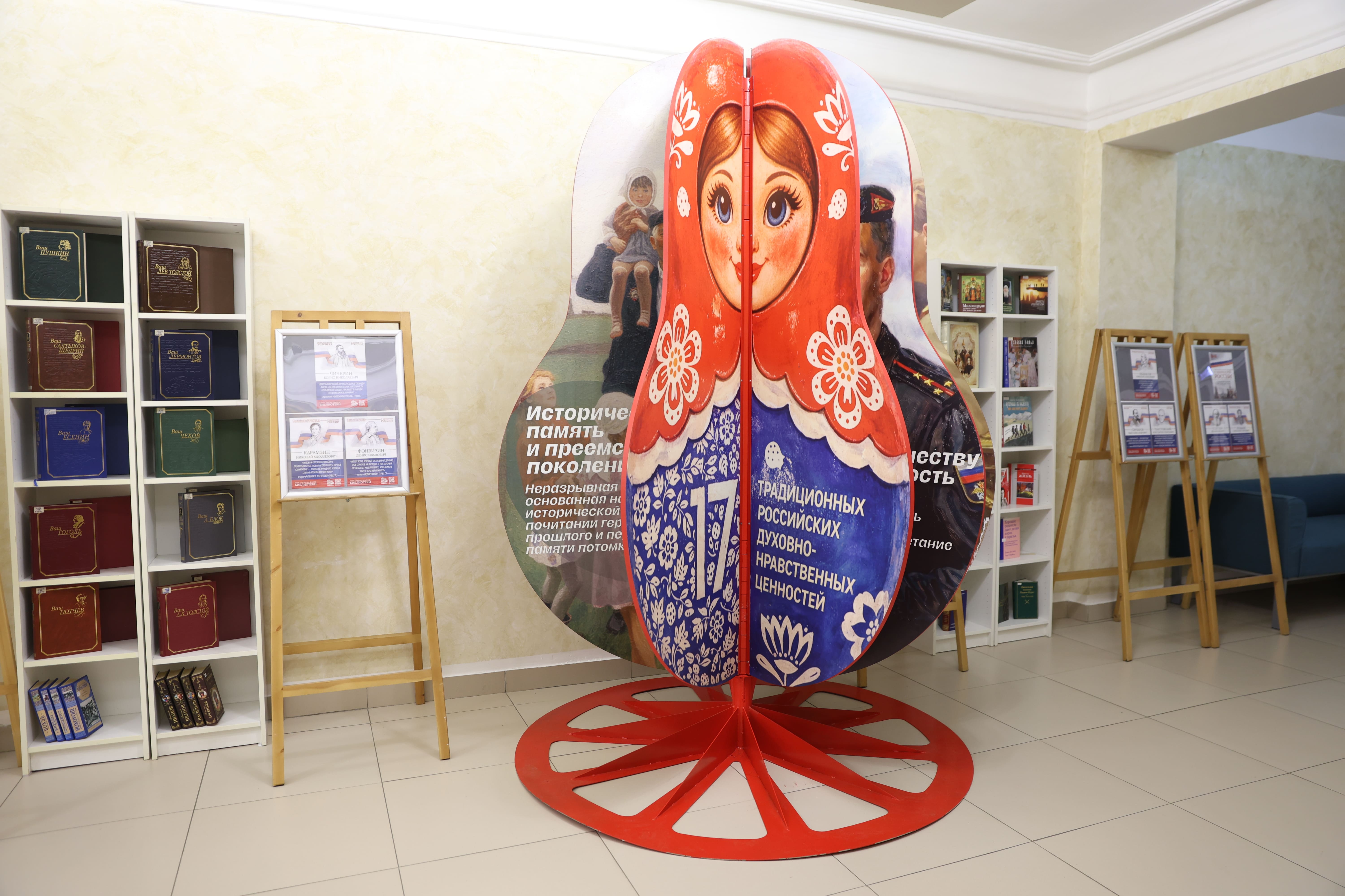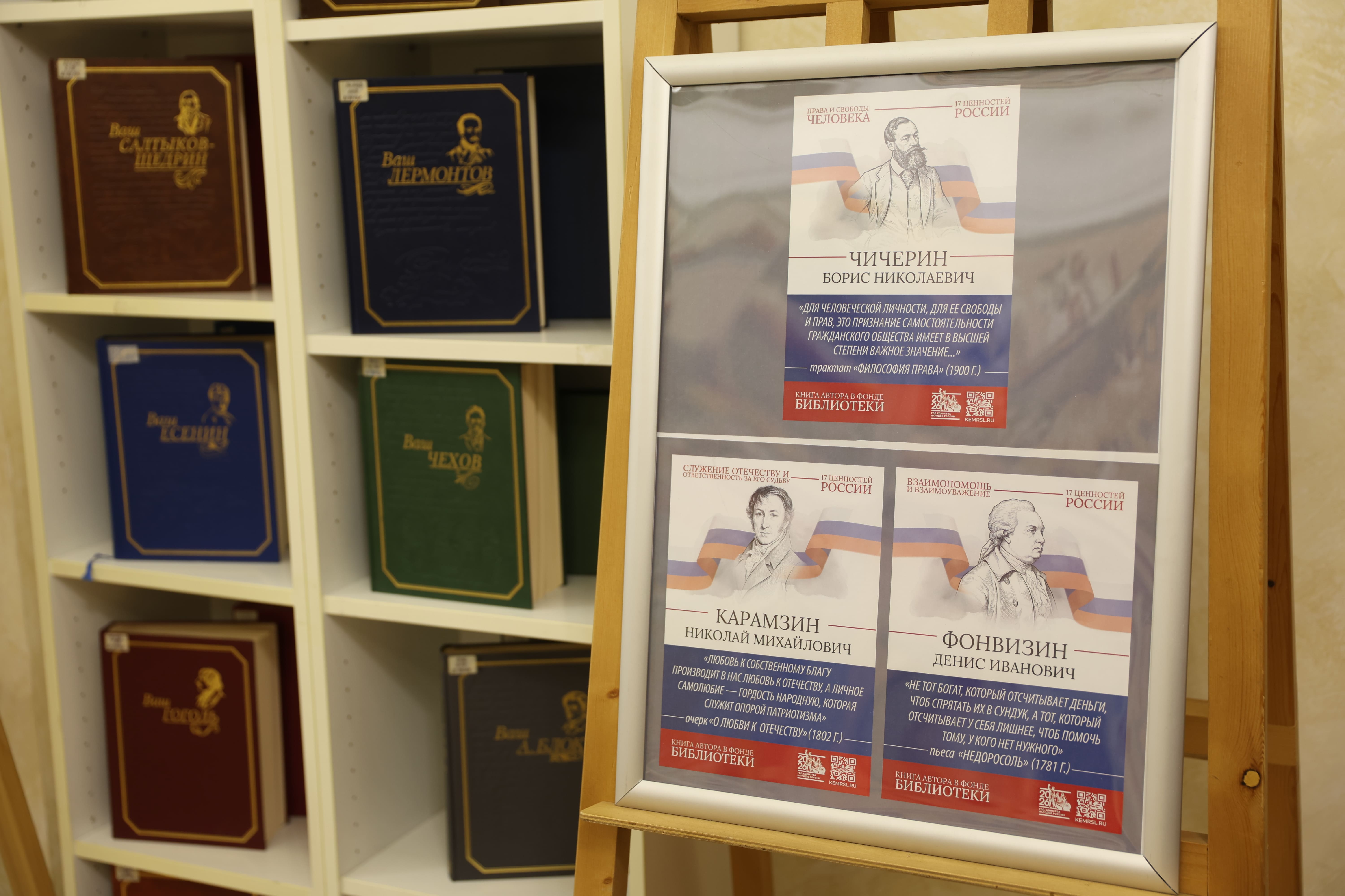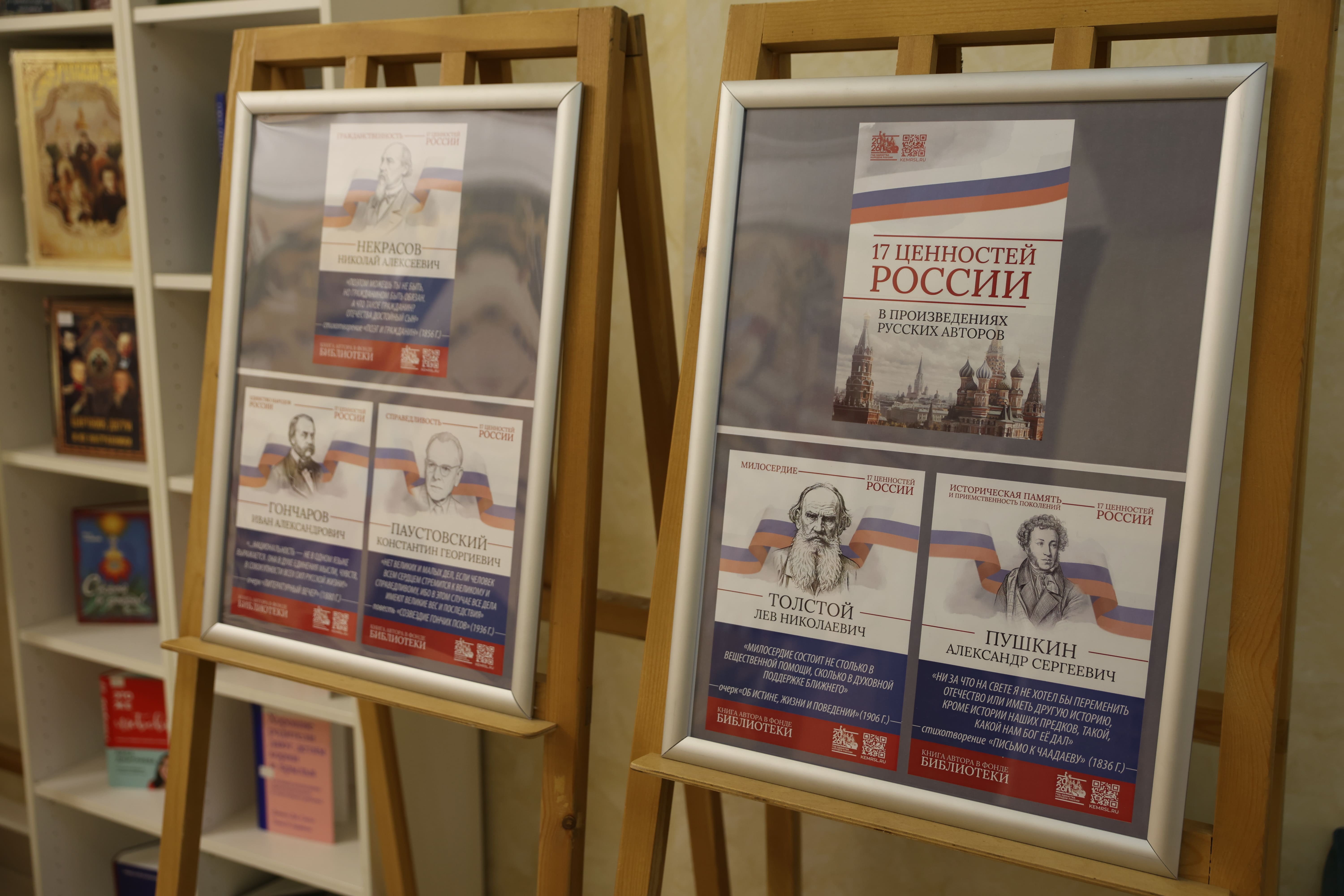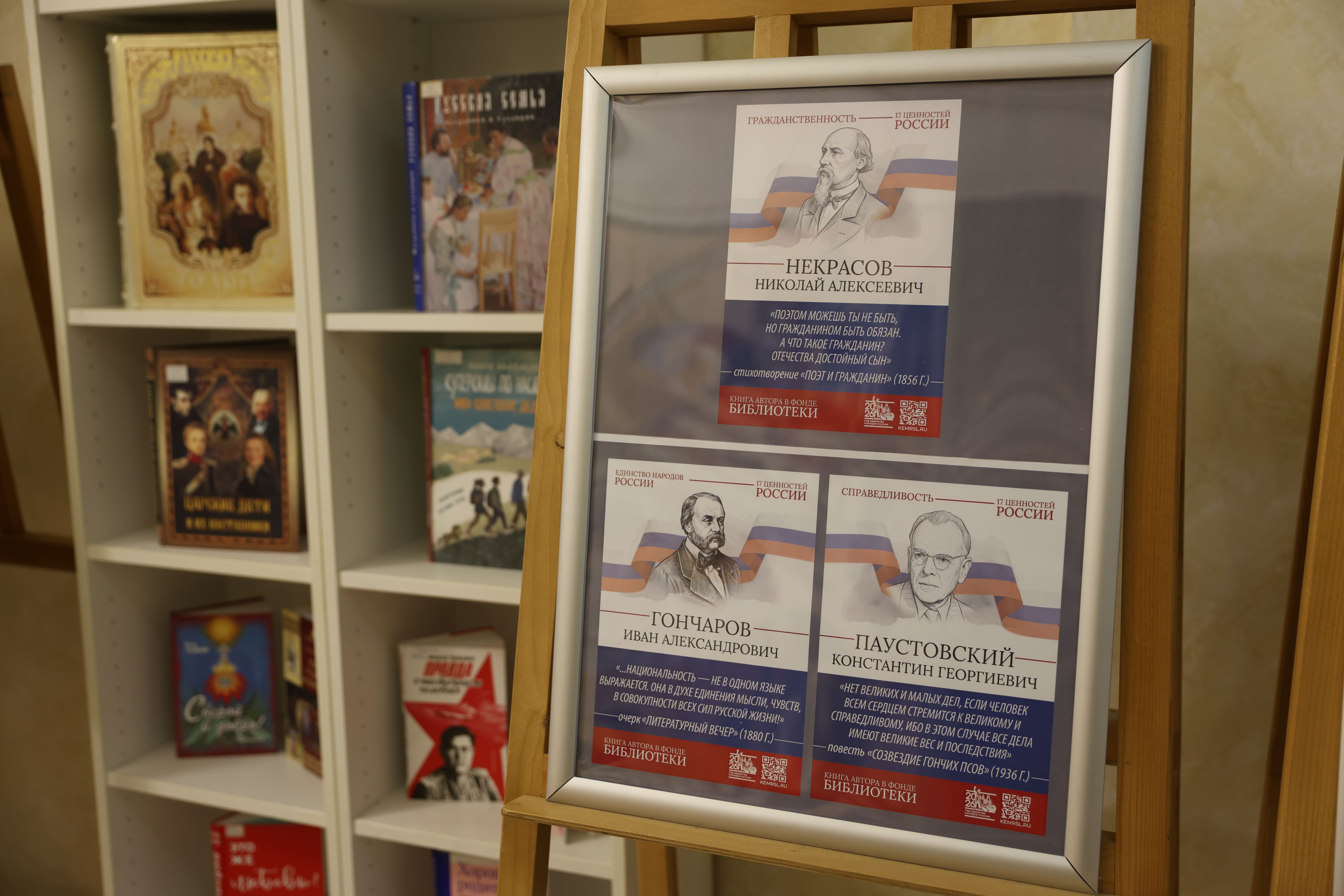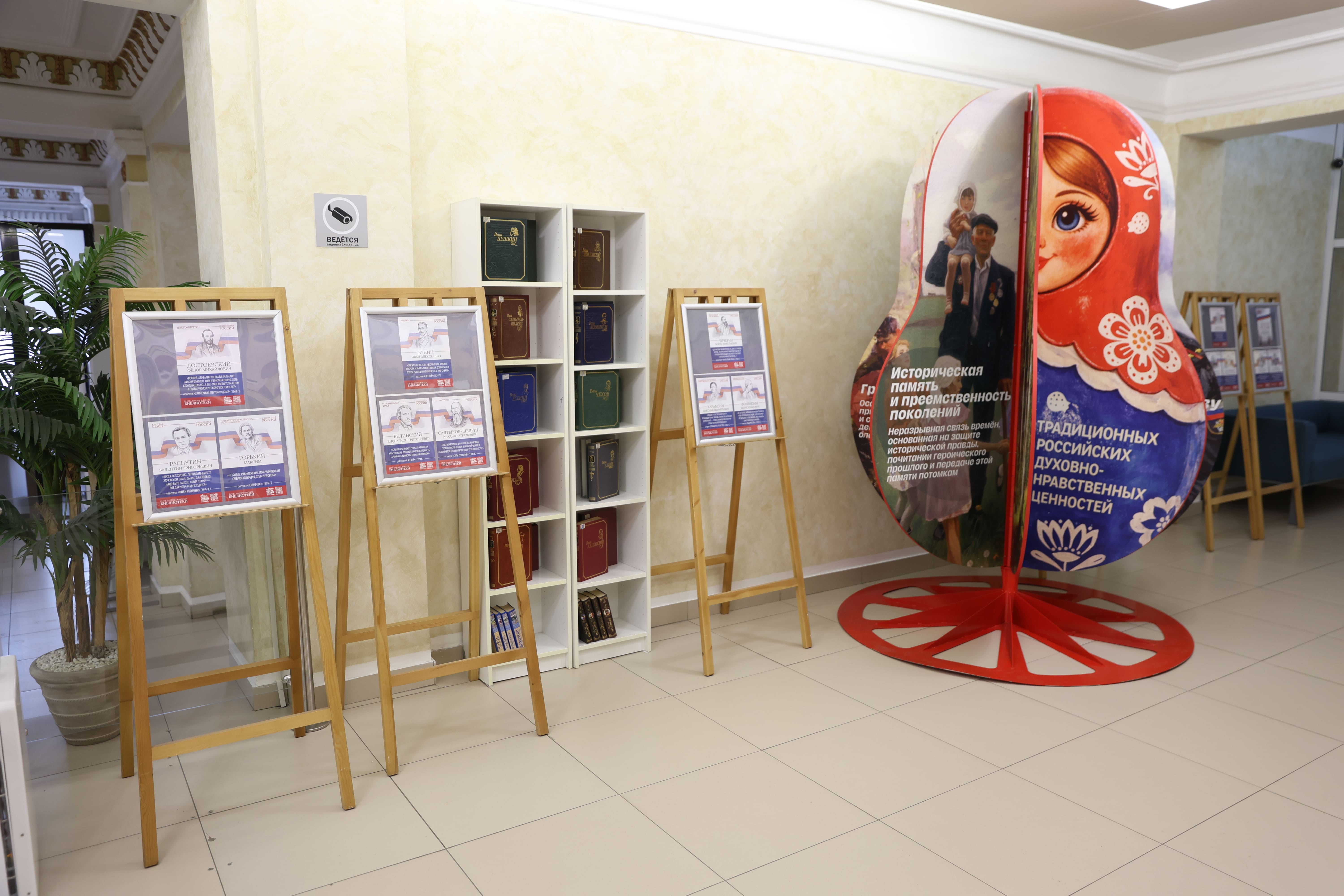 Тематическое пространство дополнено книжной выставкой, где представлены произведения русских писателей, в которых раскрываются эти 17 ценностей. Особое место в экспозиции занимает галерея портретов классиков с цитатами из их трудов. Среди авторов — И.А. Бунин, Б.Н. Чичерин, А.Н. Толстой, Л.Н. Толстой, А.С. Пушкин, М.Е. Салтыков-Щедрин, К.Г. Паустовский, Н.М. Карамзин, Ф.М. Достоевский, Н.А. Некрасов и другие.