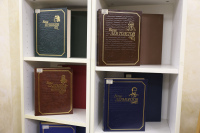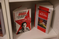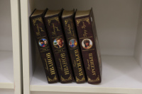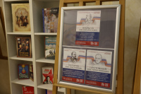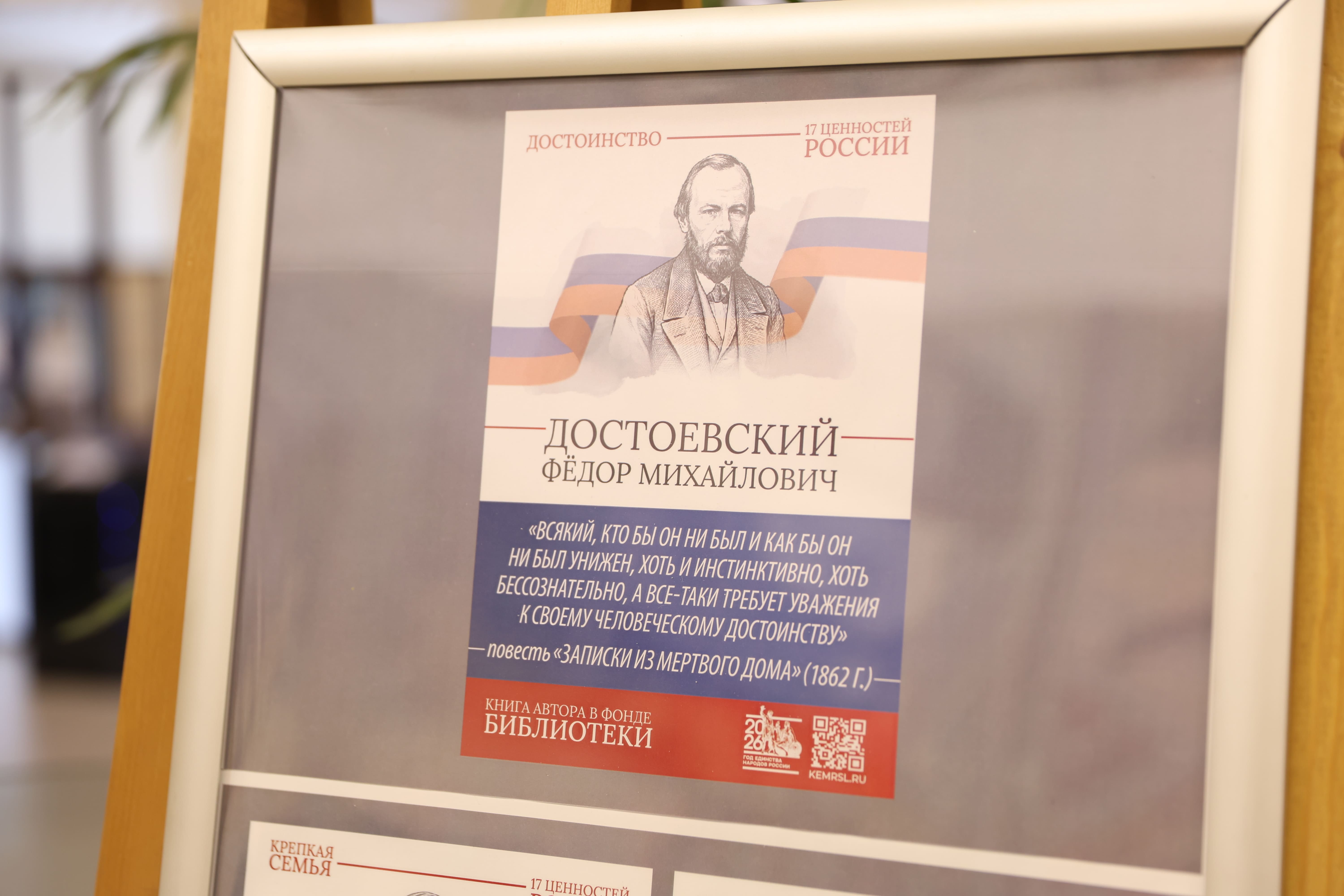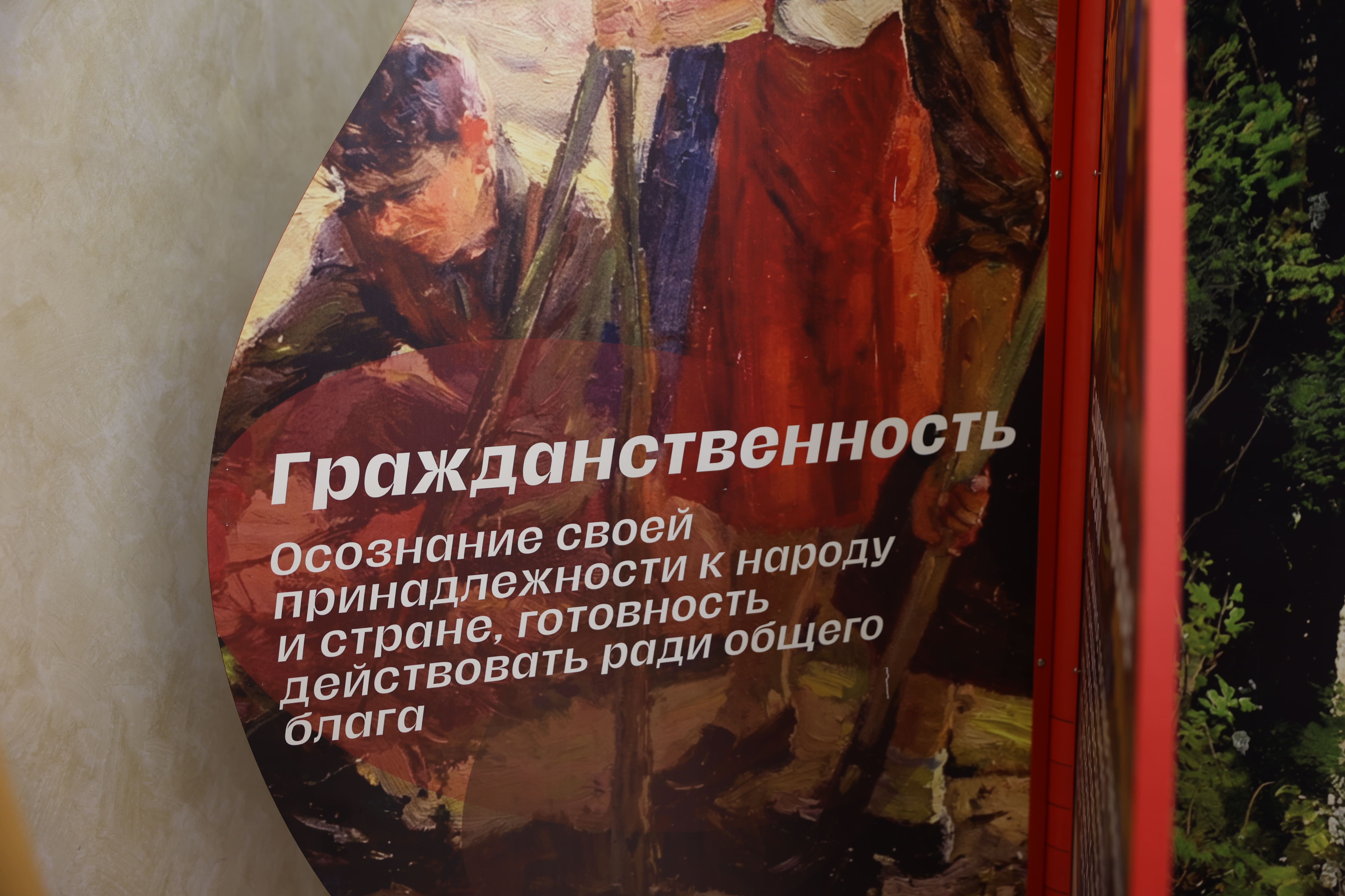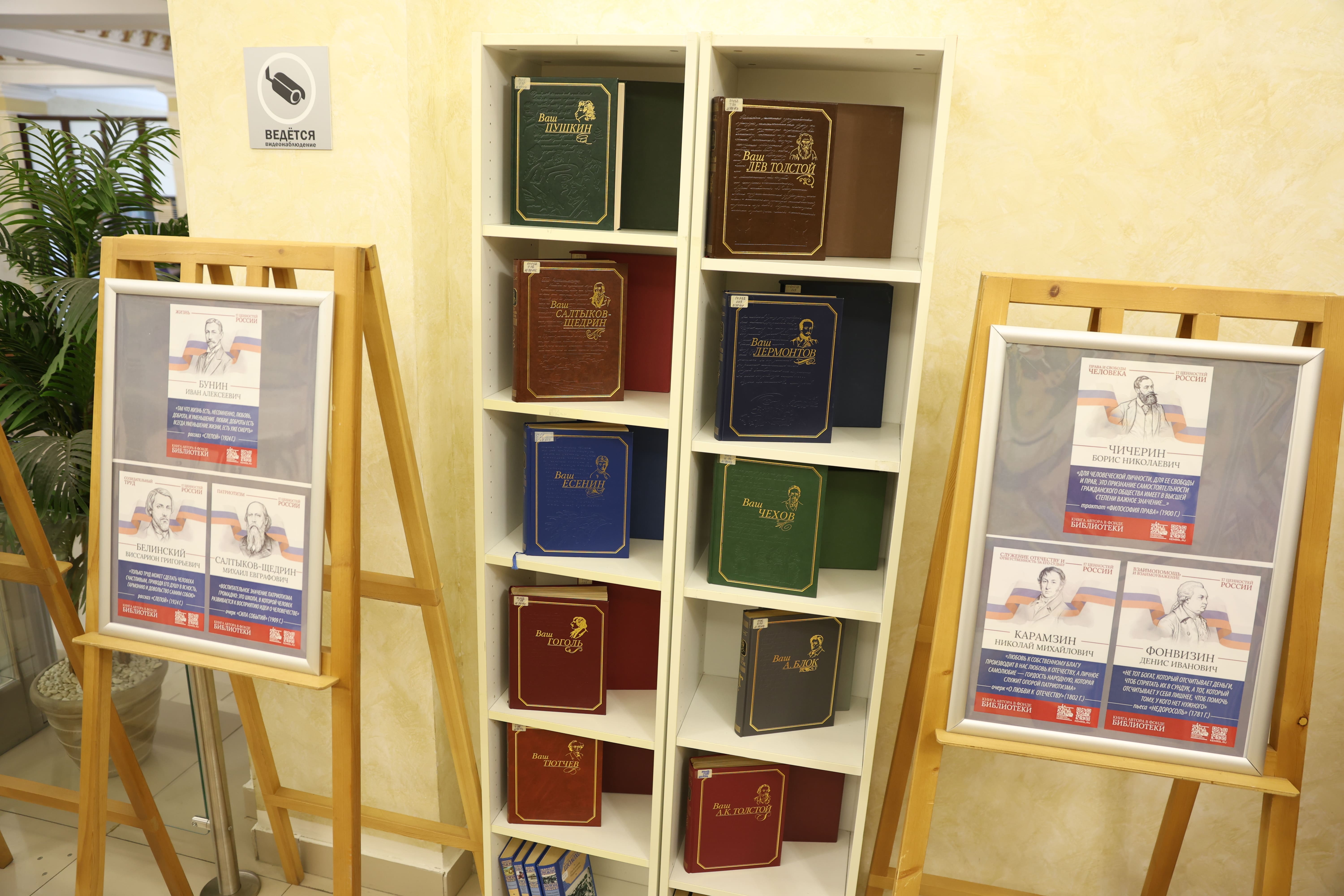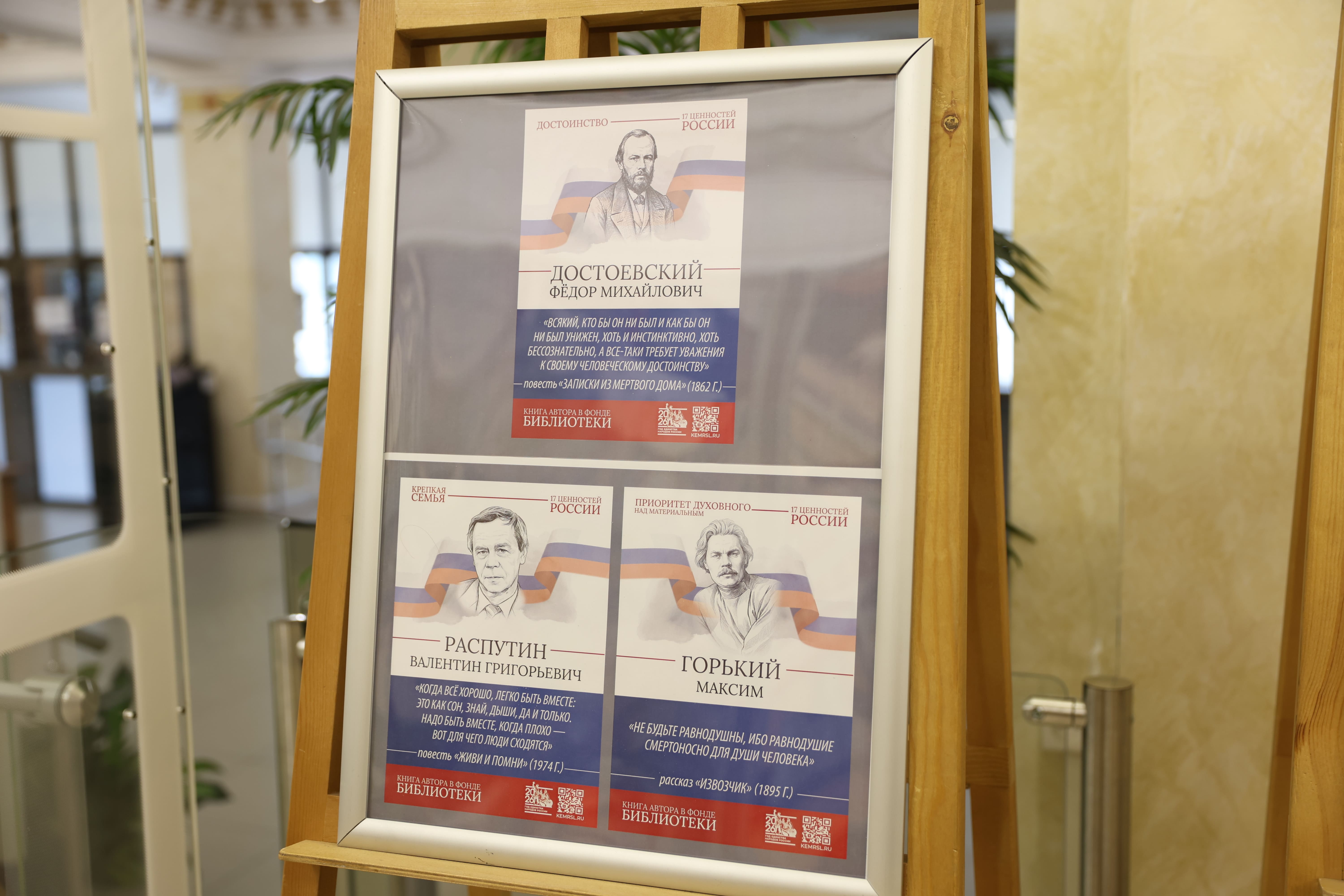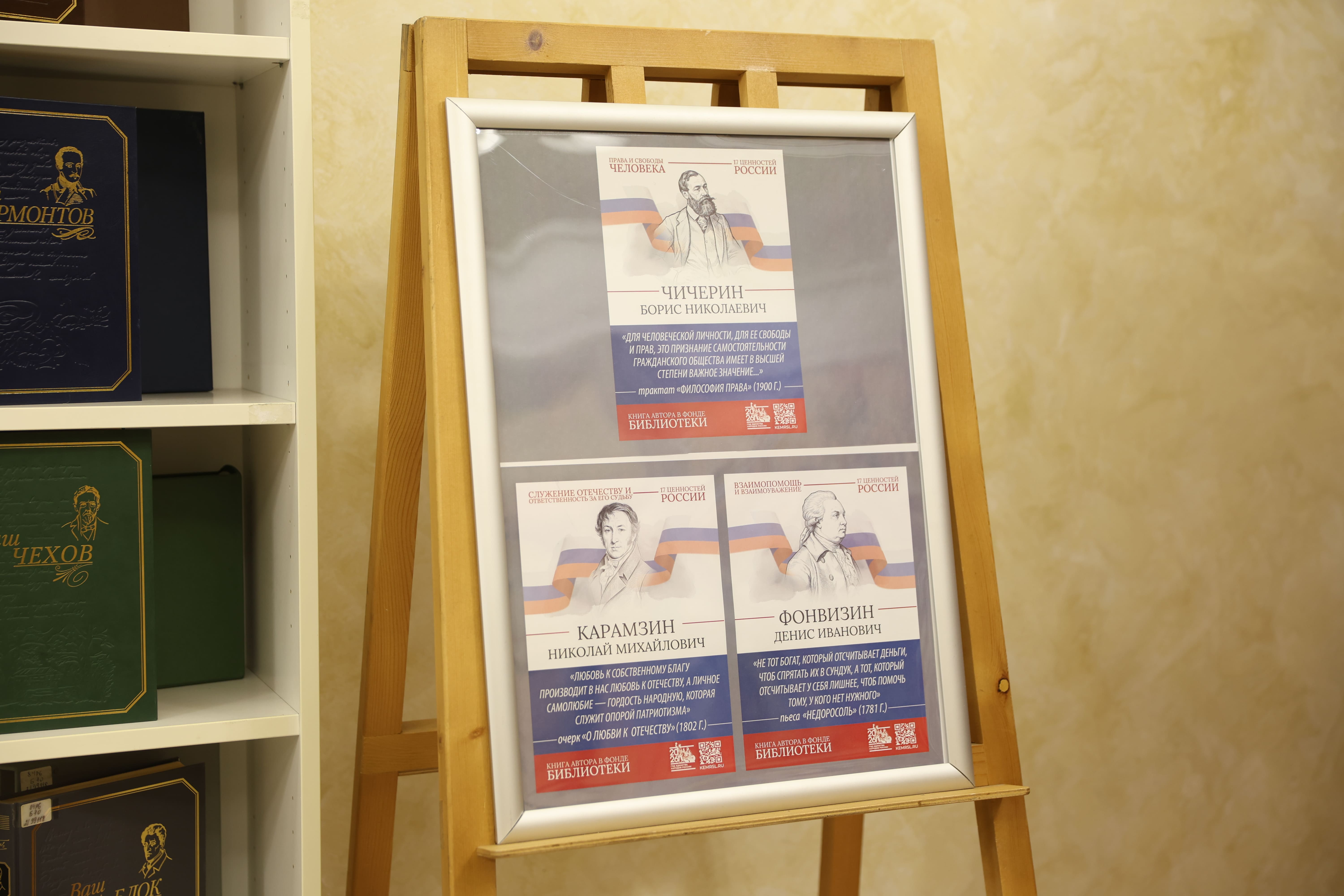 Тематическое пространство дополнено книжной выставкой, где представлены произведения русских писателей, в которых раскрываются эти 17 ценностей. Особое место в экспозиции занимает галерея портретов классиков с цитатами из их трудов. Среди авторов — И.А. Бунин, Б.Н. Чичерин, А.Н. Толстой, Л.Н. Толстой, А.С. Пушкин, М.Е. Салтыков-Щедрин, К.Г. Паустовский, Н.М. Карамзин, Ф.М. Достоевский, Н.А. Некрасов и другие.