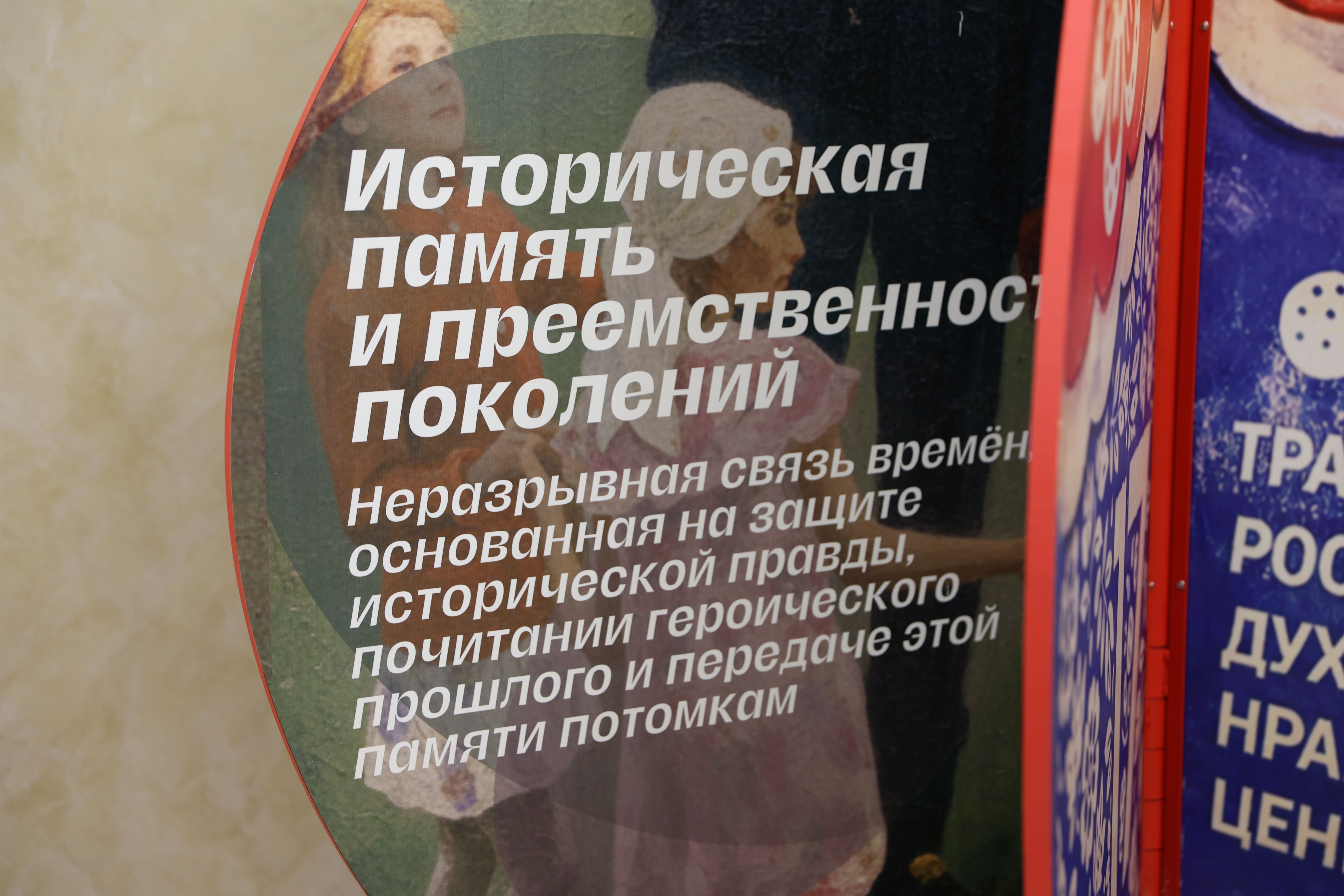 Двухметровая русская матрёшка, известная и любимая далеко за пределами России, встречает гостей у входа. Этот образ выбран не случайно: матрёшка символизирует широту русской души, многослойность отечественной культуры и служит наглядной метафорой единства народа. На поверхности арт-объекта описаны и проиллюстрированы 17 традиционных российских духовно-нравственных ценностей, составляющих основу проекта.
