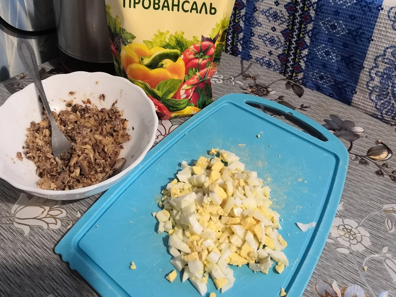 - Отварить яйца, остудить и нарезать кубиками.