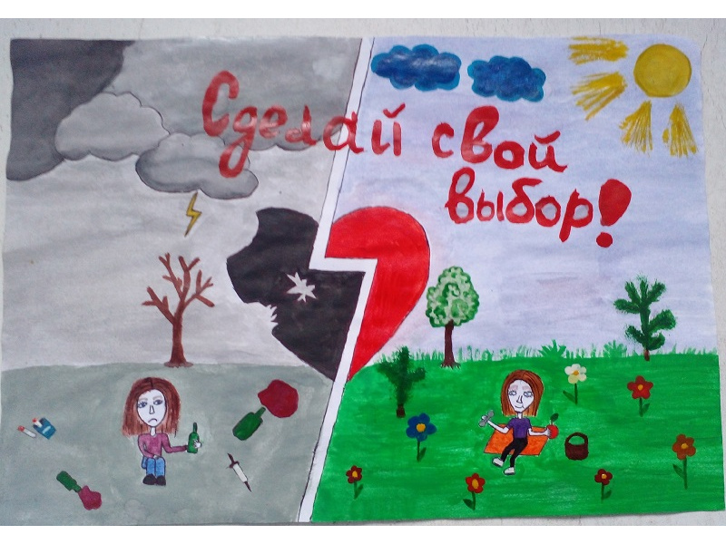 Описание работы: В своём рисунке "Сделай свой выбор" я противопоставила серую, беспросветную жизнь с наркотиками и алкоголем КРАСОТЕ полноценной жизни! ЗОЖ - это счастье! Радость! Общение с природой! Занятия спортом! и всё это - в радость! Потому что есть ЗДОРОВЬЕ - бесценный дар человеку от природы. Мои краски призывают - нельзя растрачивать этот дар впустую, нельзя забывать, что потерять здоровье легко...