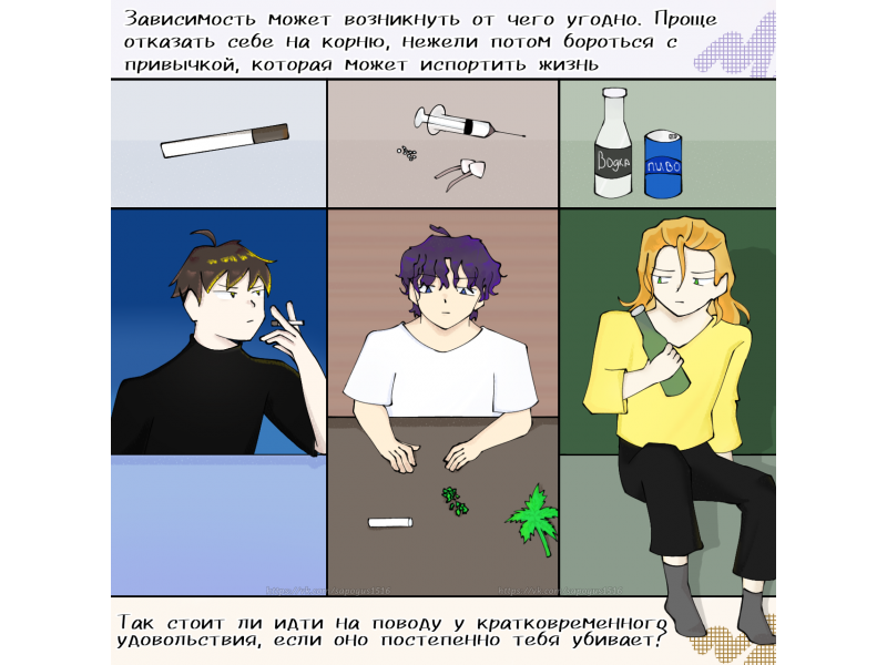 Описание работы: Стоит ли идти на поводу у кратковременного удовольствия, если это удовольствие постепенно тебя убивает? Зависимость может возникнуть от чего угодно. Проще отказать себе на корню, нежели потом бороться с привычкой, которая может испортить жизнь.
