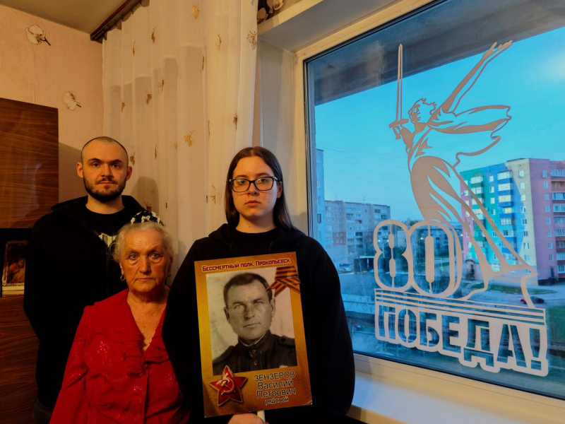 На фото моя мама - дочь участника войны Зензерова Василия Петровича и мои дети - его правнуки. У окна, оформленного к юбилею Великой Победы.