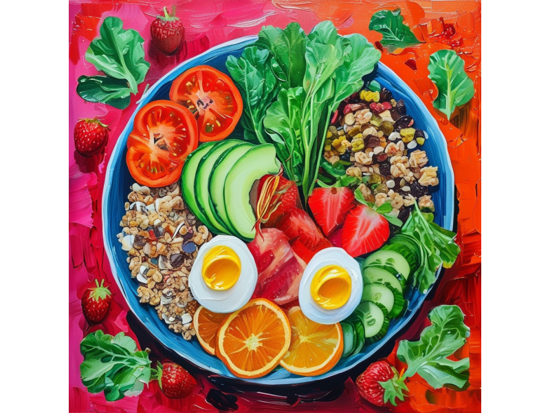 Описание работы: Лёгкий завтрак: овсянка с ягодами, орехами, овощами и фруктами, изображённый в мягких пастельных тонах.