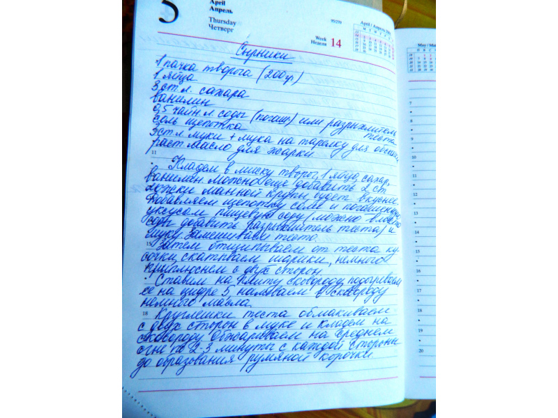 В нашем доме хранится старинная кулинарная книга рецептов. Ее начинал еще мой дедушка, в то время, когда не было Интернета. В этой книге разные рецепты первых и вторых блюд, салатов, закусок и десертов. Теперь эту книгу ведет моя мама, ну а потом буду вести я. На этот конкурс я решила приготовить сырники по нашему семейному рецепту. Мне нравится, что во всех рецептах ингредиенты записаны не в граммах, а в столовых или чайных ложках, чтобы было удобнее добавлять.