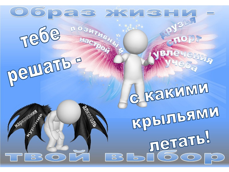 Описание работы: На плакате изображены два человека, с разными крыльями – один с красивыми цветными, символизирующими здоровый образ жизни, позволяющие быть окрыленными, летать. Другой человек с черными, опущенными крыльями, символизирующими употребление наркотиков, пьянство, курение. С такими крыльями полет невозможен.