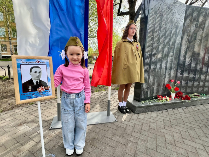Первый, осознанный, День Победы. После шествия Бессмертного полка на Аллее Славы. Держа в руке портрет прапрадеда, Корнеева Ивана Никитовича, героя семьи, у стеллы с его именем. В каждой семье бережно хранится память о подвиге и мужестве родных — Героев Великой Отечественной войны.