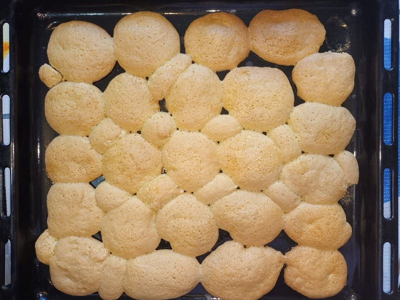 Выжить тесто на противень ложкой в виде лепешек-коржиков.