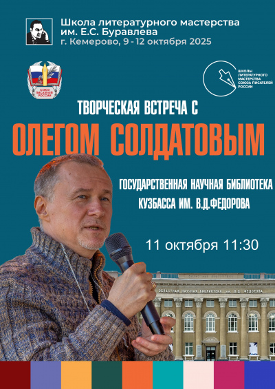 11 октября в 11:30 в Витражном зале (2 этаж) главной библиотеки Кузбасса состоится творческая встреча с писателем, драматургом, литературным критиком, членом Союза писателей России Олегом Солдатовым (г. Москва). Мероприятие пройдет в рамках Школы литературного мастерства Союза писателей России им. Е. С. Буравлёва.