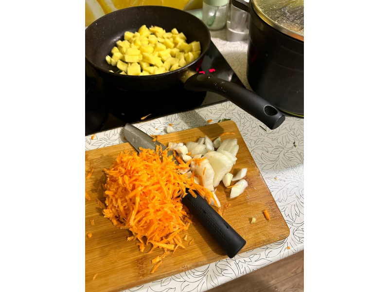 5. Картофель нарезаем средними кусочками и выкладываем в кастрюлю.