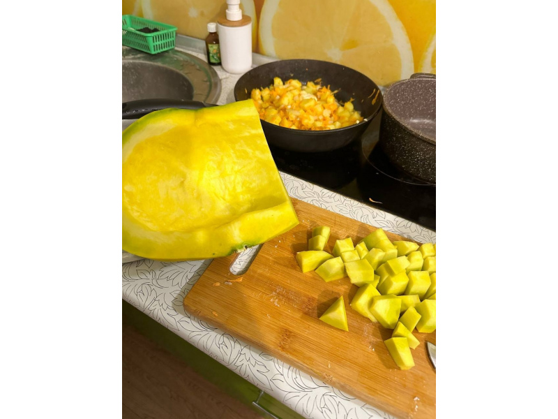1. Тыкву нарезаем кусочками средней величины. Лук мелко нарезаем. Нарезаем морковку кусочками и немного чеснока.