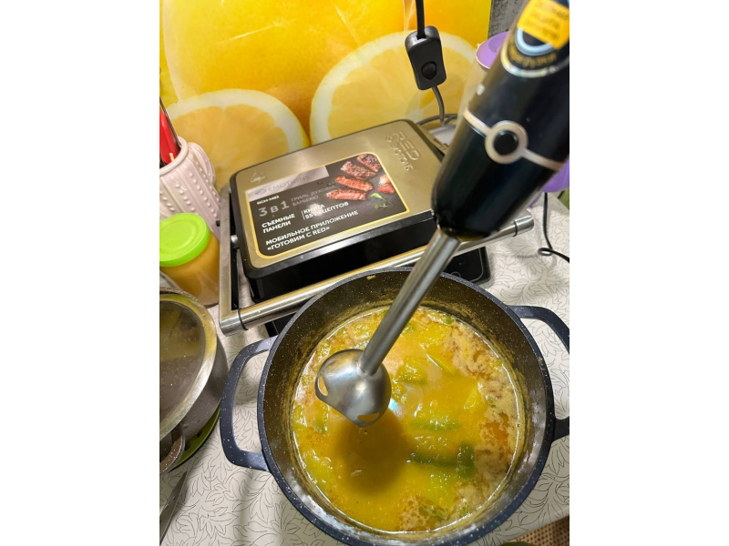 7. Готовый овощной суп с тыквой пюрируем блендером до однородной массы. Добавляем немного соли.