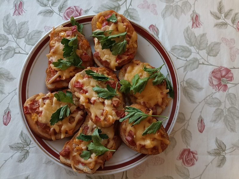 Колбасу, помидоры и перец нарезать кубиками, добавить туда 100 граммов натёртого сыра, перемешать. В отдельной миске приготовить заправку: смешать майонез, кетчуп и измельчённый чеснок. Соединить заправку и нарезанные кубиками ингредиенты, поперчить. Разложить на ломтики батона и отправить в разогретую до 180 градусов духовку на 10 минут. Вынуть из духовки, посыпать оставшимся тёртым сыром и отправить обратно в духовку на несколько минут, чтобы расплавился верхний слой сыра. При желании перед подачей посыпать зеленью.
