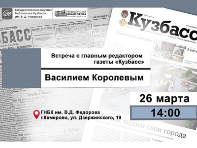 26 марта 2026 г. в 14.00 в видео-конференц зале Государственной научной библиотеки Кузбасса им. В.Д. Федорова (г.Кемерово, ул. Дзержинского, 19) состоится встреча с главным редактором газеты «Кузбасс» Василием Александровичем Королевым.