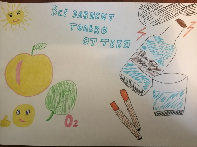 Описание работы: На рисунке изображены вредные привычки под чёрной тучей и всё хорошее под солнцем.