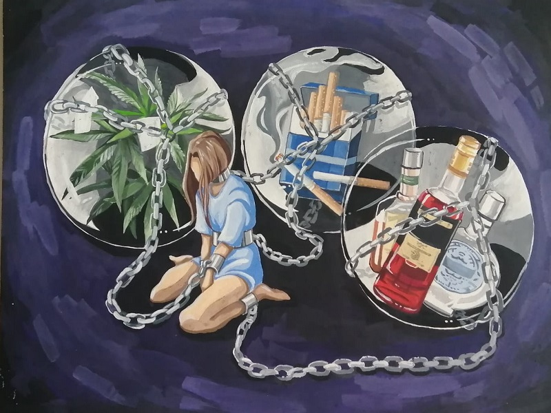 Описание работы: Работа выполнена гуашью. Работа показывает насколько может быть слабым человек, его зависимости сковывают его не давая полноценно жить, и от которых порой так сложно избавиться.