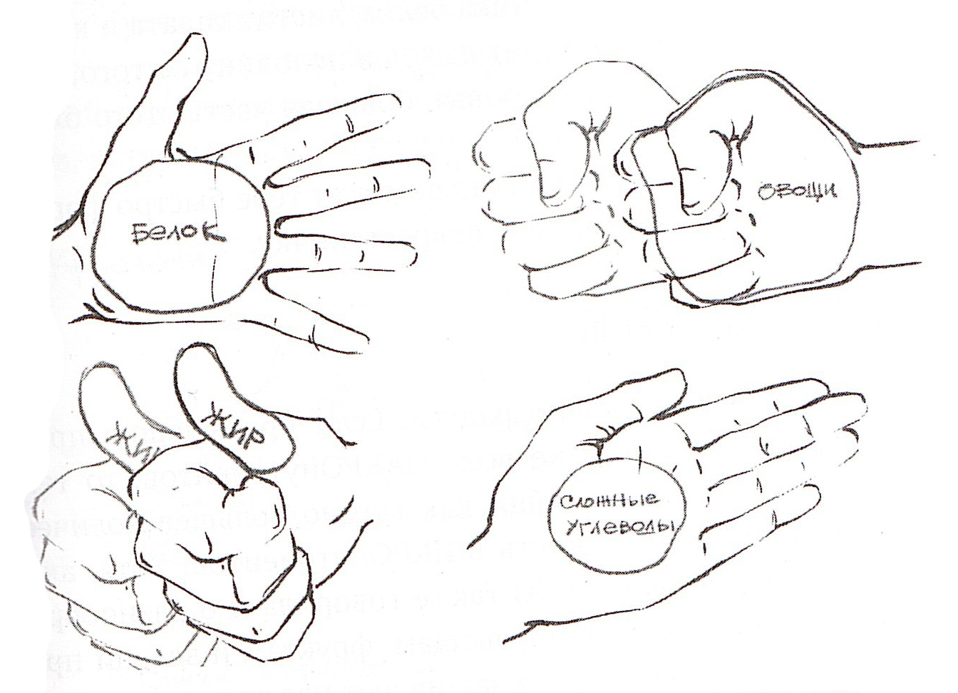 Диаметр тарелки 22 или 24 см. Условно разделите ее пополам, а потом из половин еще раз пополам. Получится 3 части: одна часть – половина тарелки, и две части – по четверти. Каждой части будет соответствовать определенный вид продуктов: